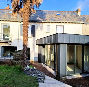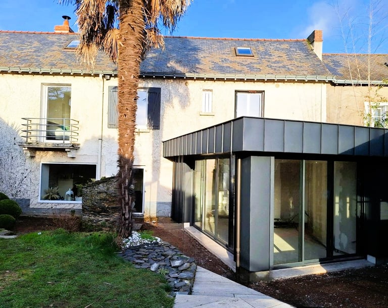 Réalisation d’une extension de maison au style contemporain, en harmonie avec le charme traditionnel de la maison existante. De grandes baies vitrées ont été installées pour apporter un maximum de lumière naturelle et créer une sensation d’espace et de fluidité. Le bardage en zinc joint debout apporte une touche moderne et élégante à l’ensemble.