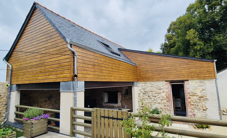 L’enveloppe extérieure a été repensée avec un bardage bois naturel et une couverture en ardoise, assurant une parfaite cohérence entre tradition et modernité.
