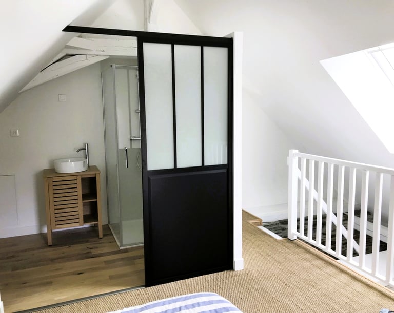 Le projet a permis de créer un espace confortable intégrant chambre, dressing et salle d’eau privative, tout en assurant une parfaite continuité avec la maison d’origine.